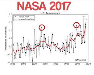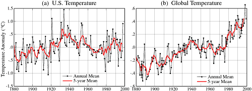 The graphs below show the 1999 published data from NASA. On left there seems to be no pattern on the right the global temperature anomalies show an increasing trend. Anomalies are measured by taking the difference between yearly temperatures and the 30 year average, see the Y-axis, 1.0 means that the yearly average was 1degree hotter than the 30 year average. In the US the temperatures in the 1930s were very hot over a wide spread area, this is the dust bowl period.